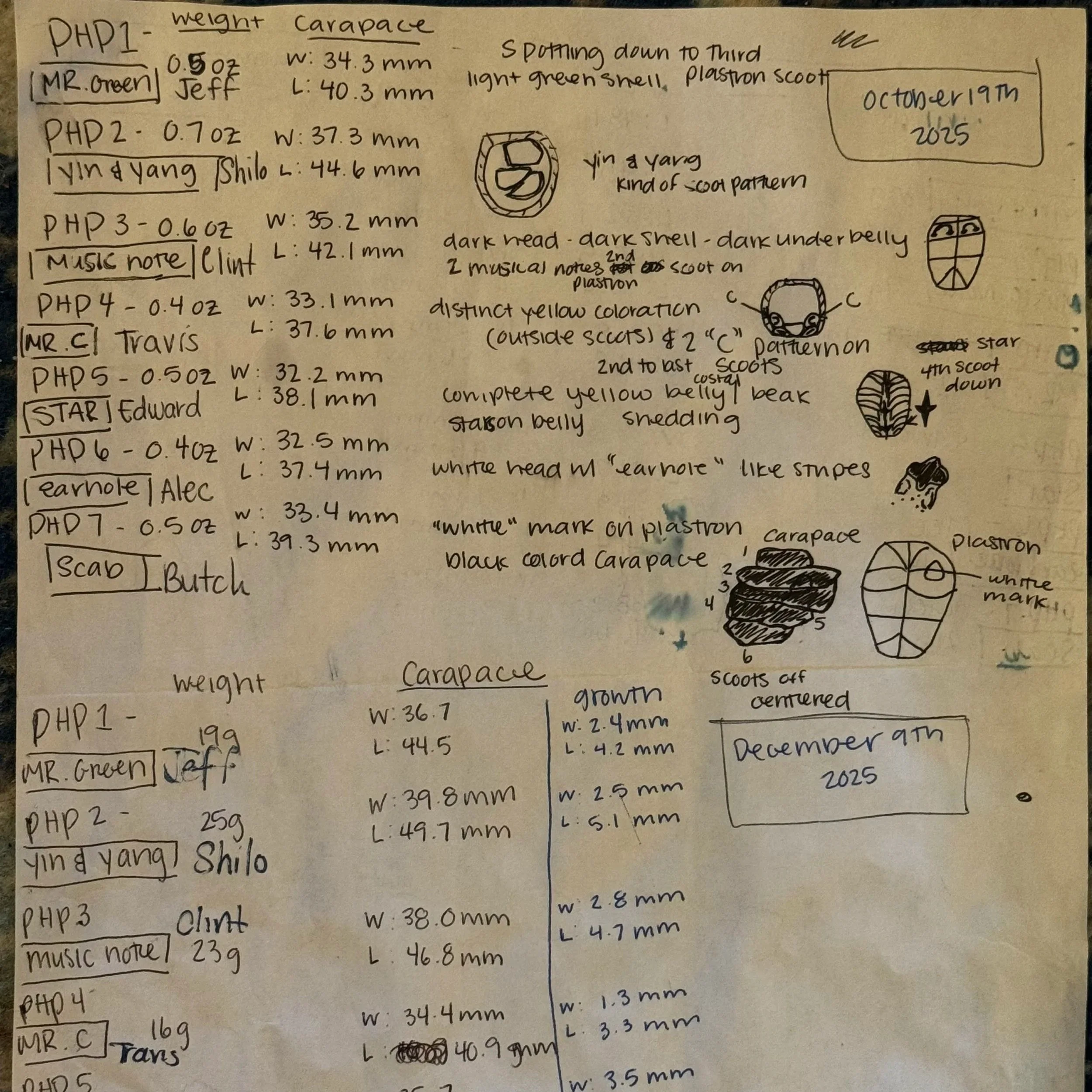 During each session, volunteers Reanna and Johnnae, carefully measured and recorded each animal's weight in grams and carapace width and length in millimeters, by hand, on paper. Four sessions. Seven animals. Months of careful work. All of it sitting in a notebook, waiting for someone to find the hours to process it.
